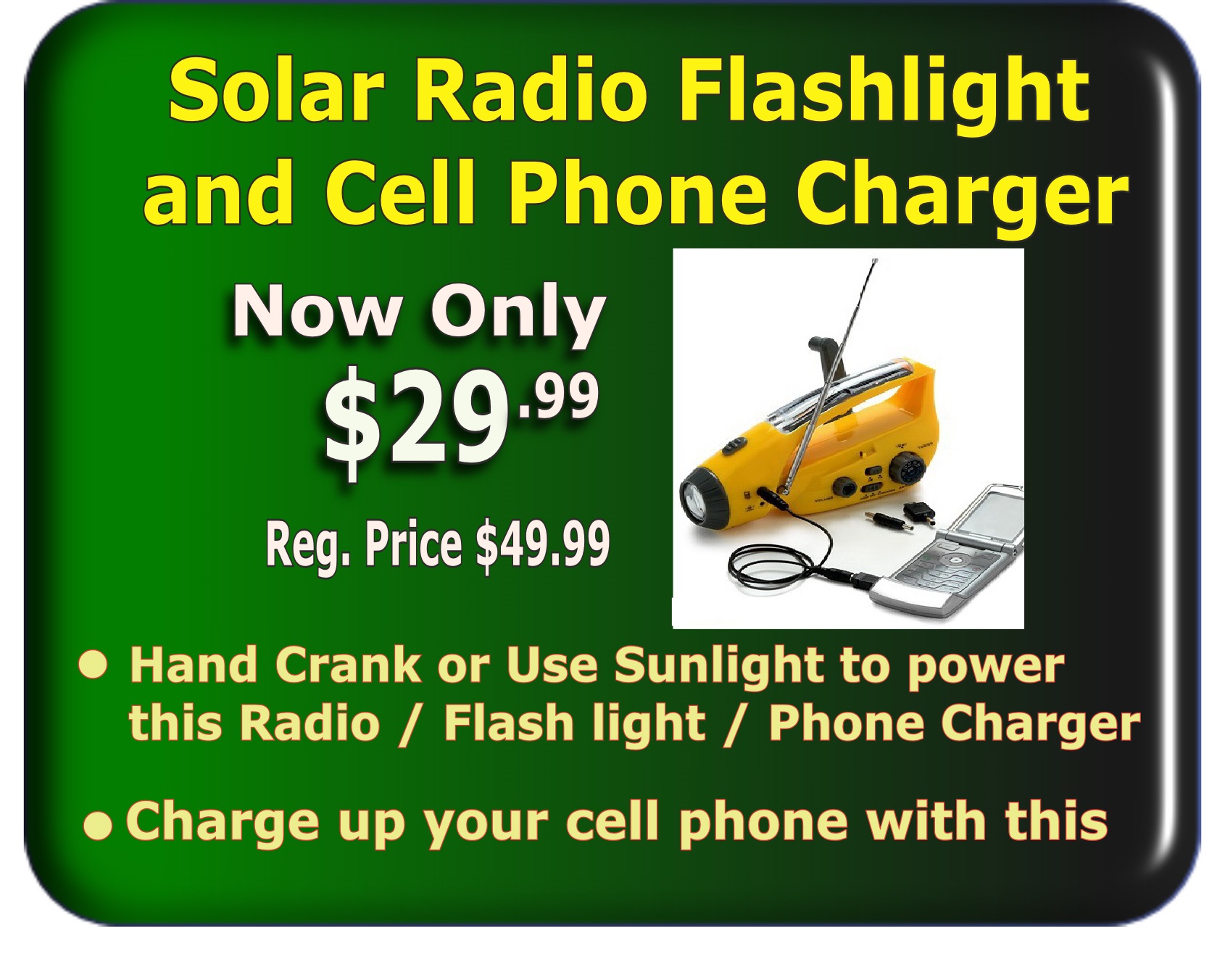 | | __________________________________________________________________________________Item Being Sold: Solar Radio FlashlightPrice: $ 29.99Category: electronicsCondition: New | | |